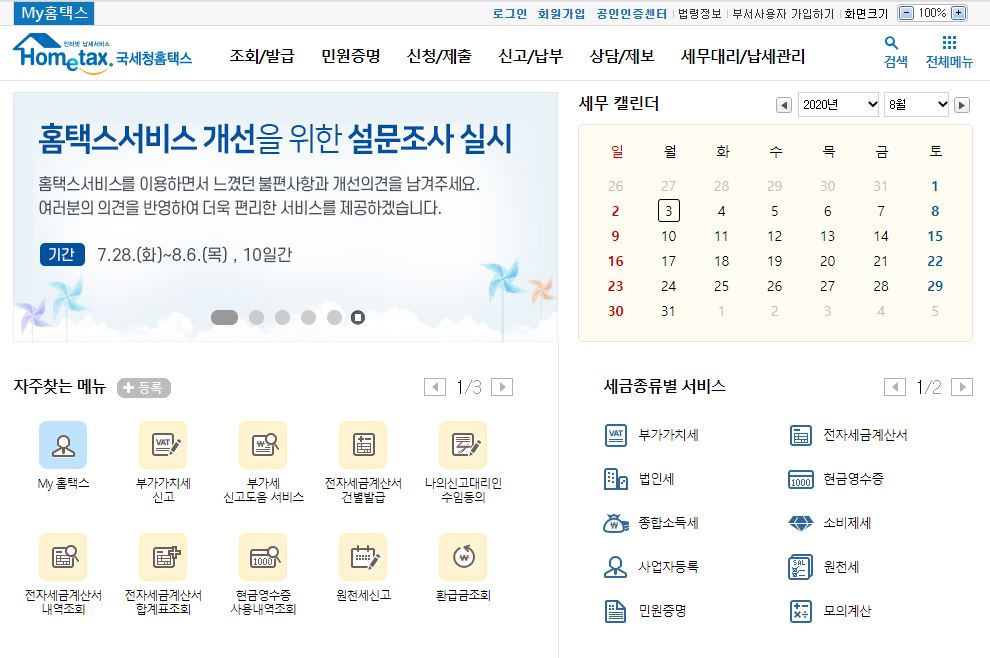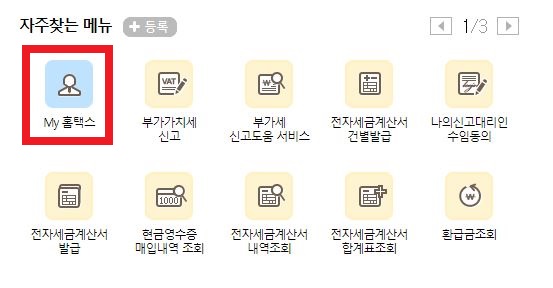 홈텍스 로그인 후 메인의 자주찾는 메뉴
