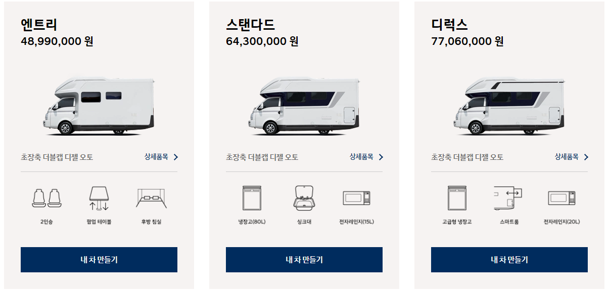 포터캠핑카 종류는 엔트리, 스탠다드, 디럭스