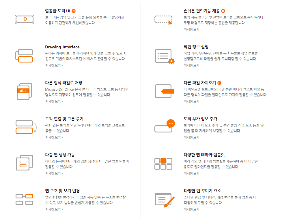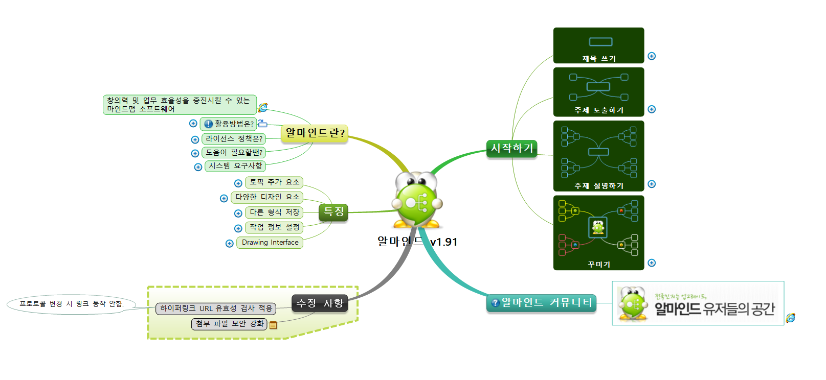 알마인드는 마인드맵® 이론을 구현한 프로그램으로, 알마인드만의 독창적인 인터페이스인 Drawing Interface, 작업 정보 설정, 토픽 추가 설명 기능, 다른 파일 형식과의 호환성 지원 등을 통해 개인