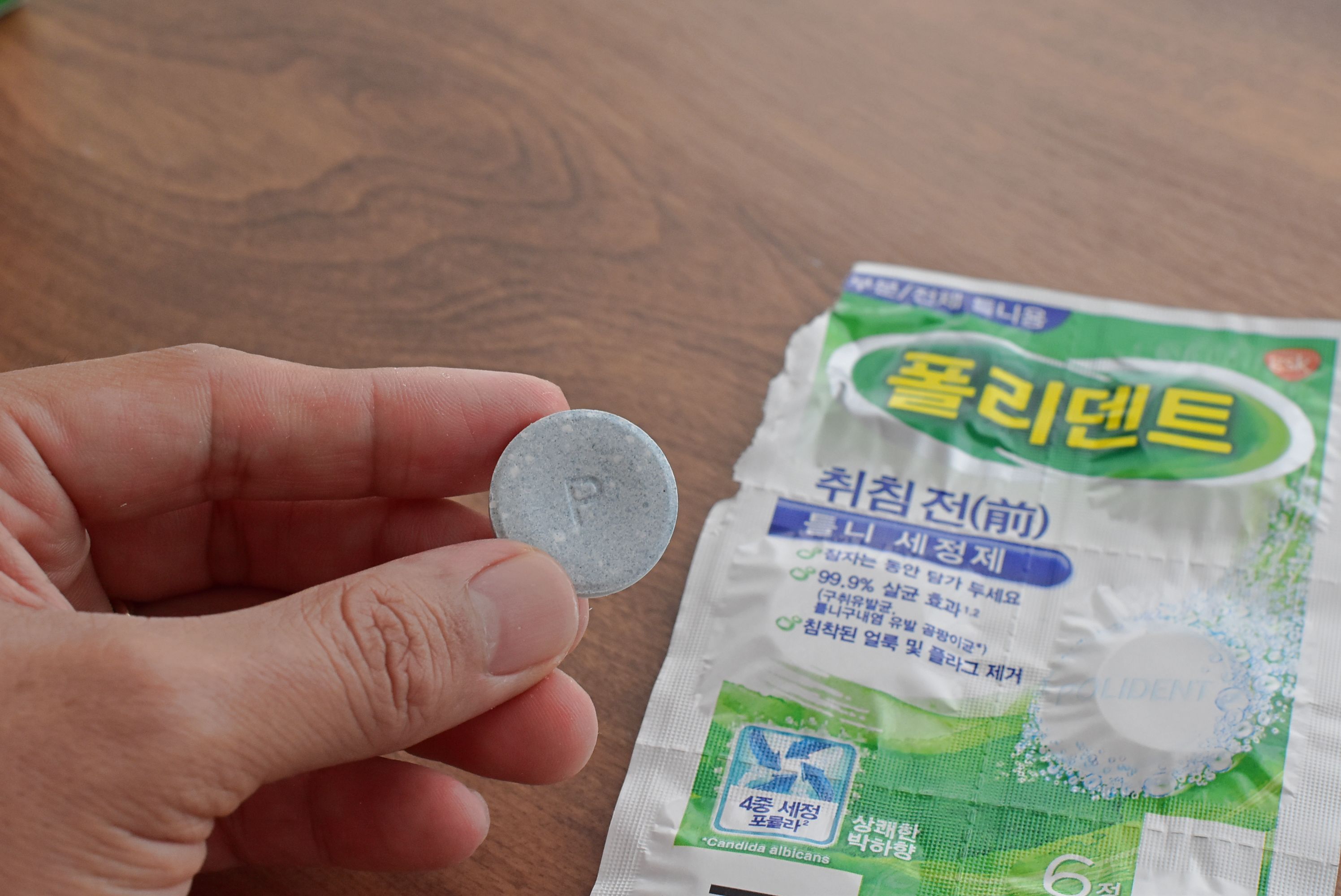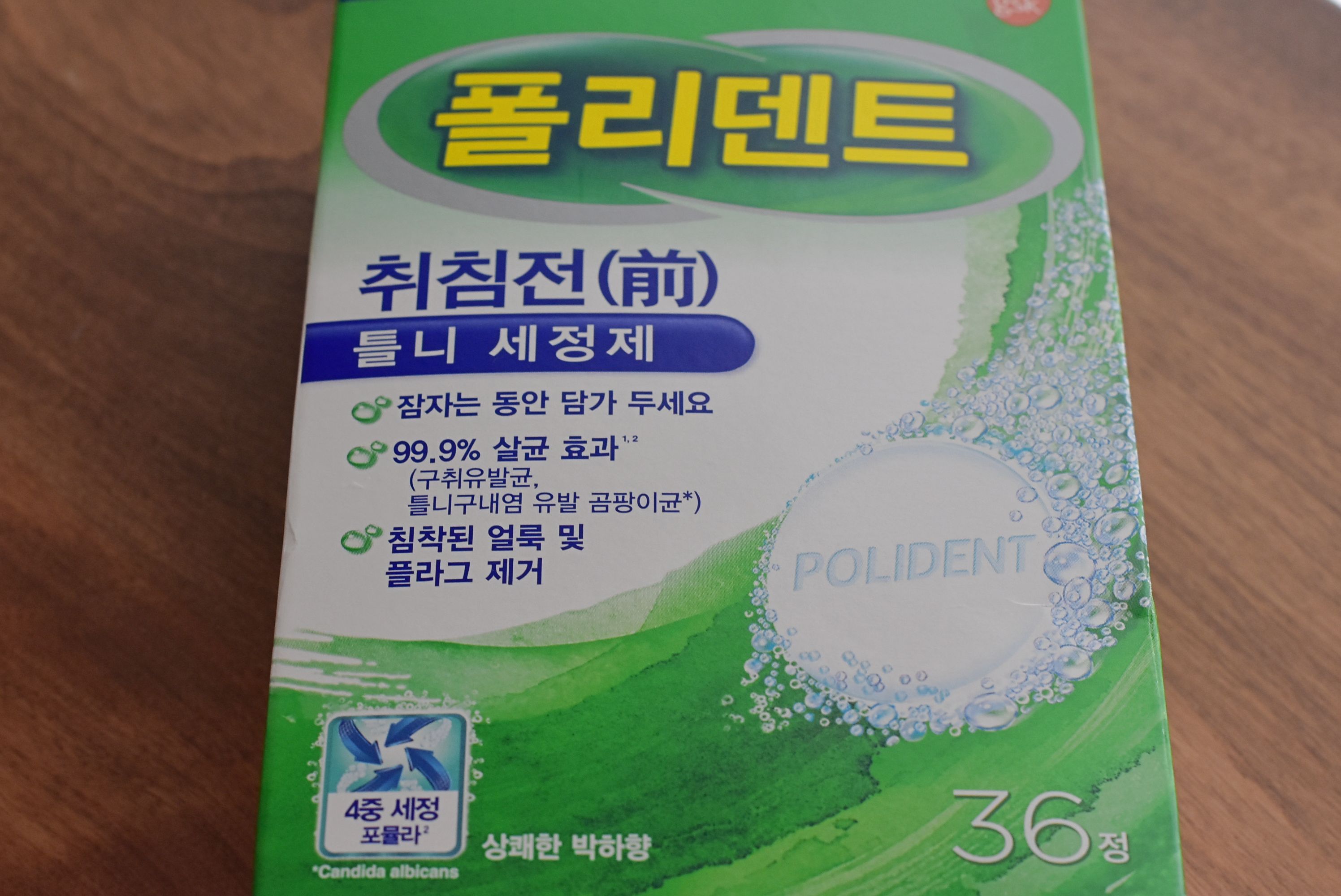 아침에 양치하면서 폴리덴트 세정제에