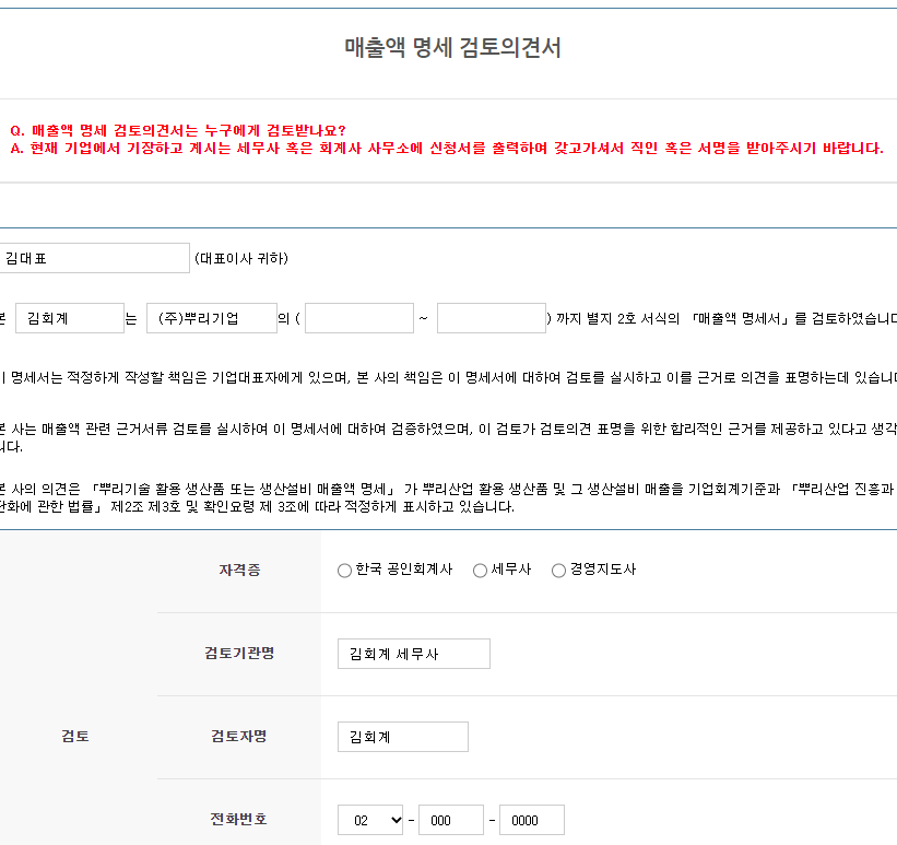 뿌리기업확인서 발급신청서, 매출액 명세서
