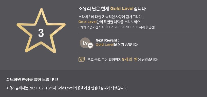 별 12개 적립마다 무료쿠폰 받는 Gold Level까지