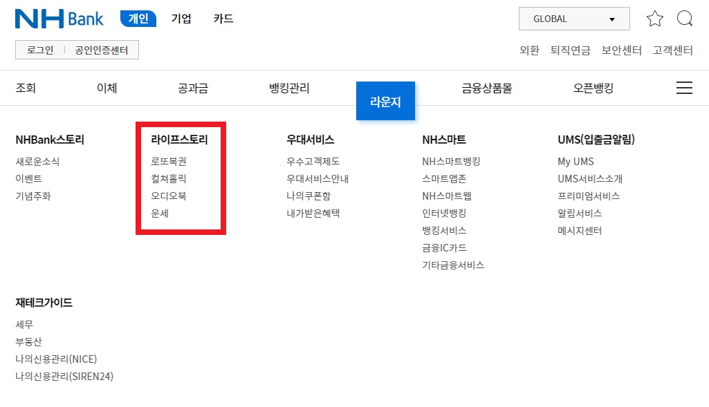 농협 홈페이지에서 라운지 클릭