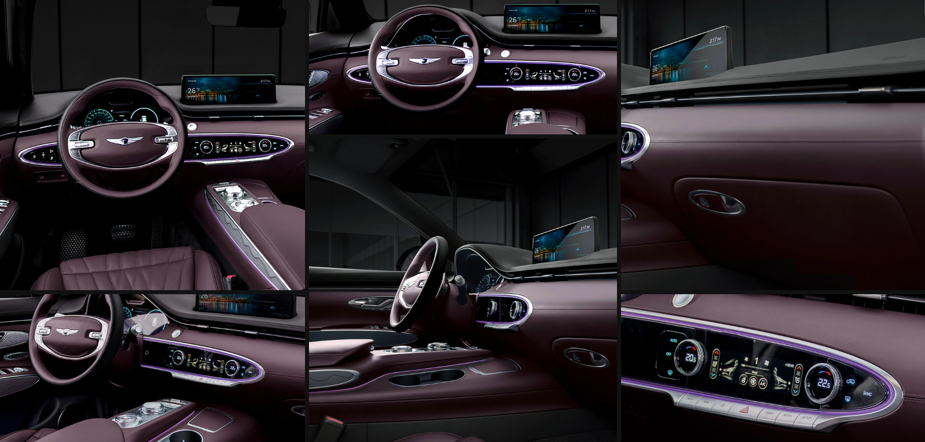 특히, 비행기 날개의 유선형(에어로다이나믹) 조형에서 영감을 받은 스포티한 실내 디자인은 유니크한 타원형 요소를 사용, 풍부한 볼륨감을 살렸고 이를 강조하는 신개념 무드조명으로 GV70만의 개성을 살렸다.