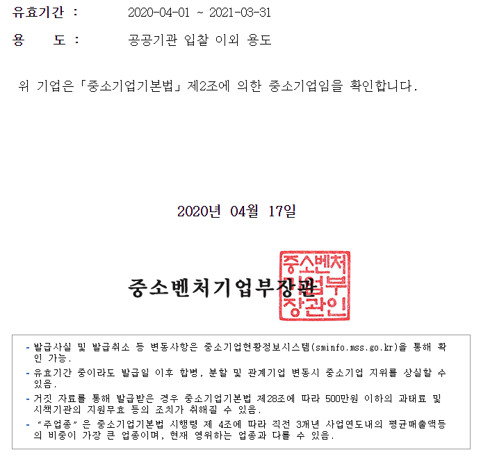 중소기업확인서 발급받을 수 있습니다.