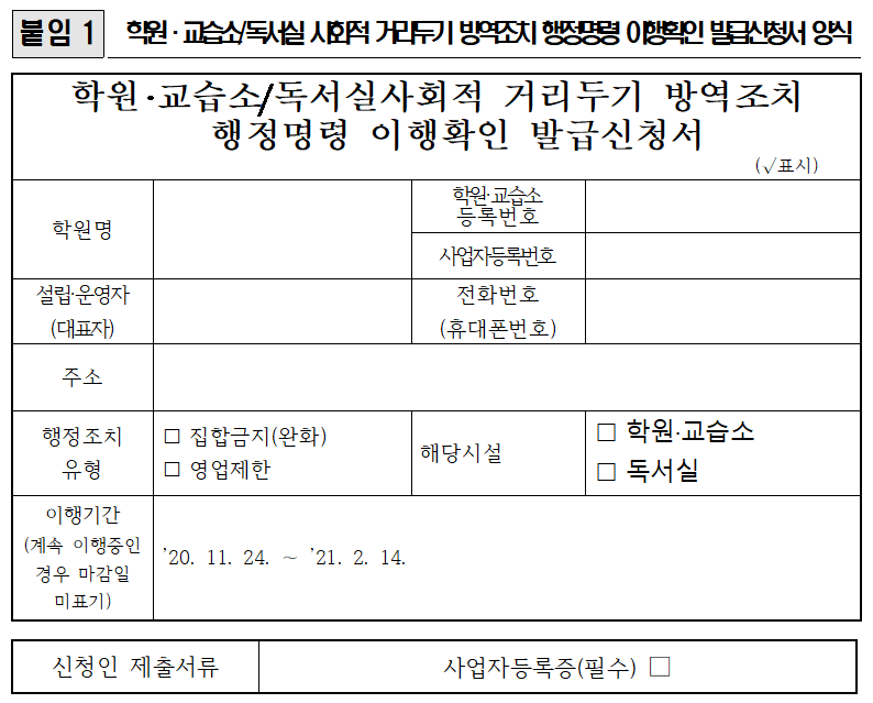 전국 공통으로 행정명령 이행확인서