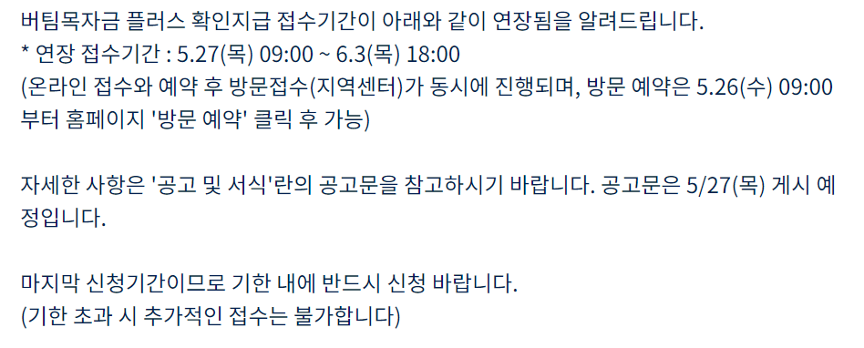 소상공인 버팀목자금 플러스 확인지급 기간이 6월 3일까지로 연장되었네요. 신규개업으로 저는 아직까지 지급 못 받았는데 언제쯤 받을 수 있을지 접수기간이 연장된다는 것은 그만큼 지급심사가 지체 된다는 것이겠네요.