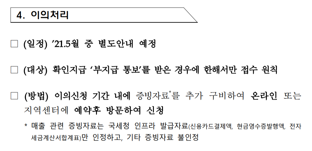 혹시 재난지원금 받을려고 신청 후 부지급 통보를 받았다면, 명확하게 버팀목 자금을 받을 수 있는 조건이 되었는데도 안 나온다면 꼭 이의신청해보세요. 지원금 지급이 이렇게 늦어지는 이유는 공무원들이 신청건에 대해 하나씩 확인하면서 심사를 하다보니 지연되는 것인데 실수할 수 있겠지요. 그러니 지원금 대상자인데 버팀목자금 플러스 부지급 통보를 받았다면 이의신청 해봐야겠죠.