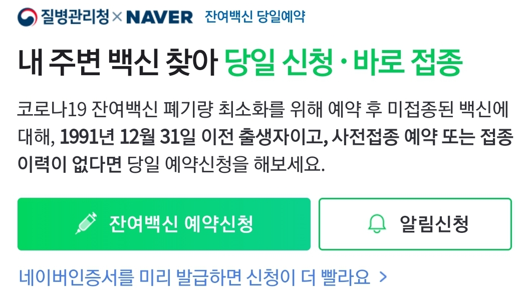 네이버 잔여백신 당일예약 서비스는 1991년 12월 31일 이전 출생자로, 사전접종 예약 또는 접종 이력이 없다면 주변 접종병원을 검색 후 당일 예약 후 바로 접종 할 수 있습니다.