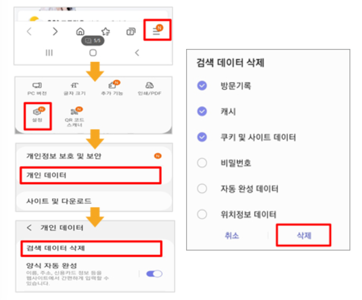 설정 > 개인데이터 > 검색데이터 삭제메뉴를