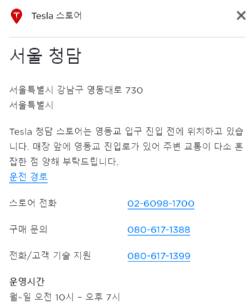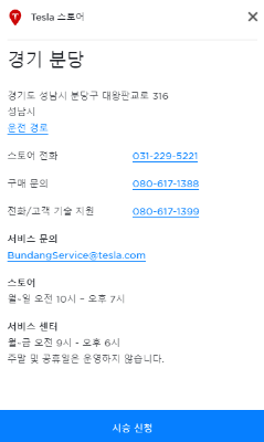 우리나라에는 현재 5개의 테슬라 스토어가 있는데 서울 청담, 경기 하남, 경기 분당, 부산 연제구, 대구 수성구에 있으므로 테슬라 시승 목적으로 스토어에 방문하신다면 미리 전화로 시승문의 후 방문해야 겠습니다.