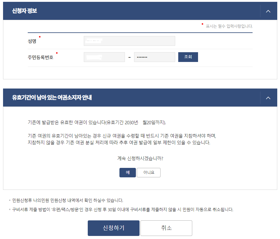 만약, 기존에 발급받은 유효한 여권이 있을 경우에는 알림과 함께 기존 여권을 받납하도록 하고 있으므로 온라인 여권 발급이 분실에 의한 재발급일 때는 직접 방문해서 여권을 발급 받는 것이 좋습니다.