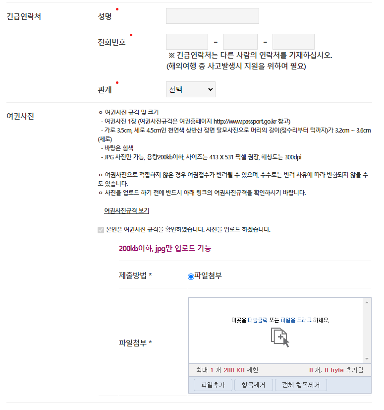 여권 재발급시 개인정보를 자동으로 불러들여지기 때문에 재발급 하고자 하는 여권면수와 발급된 여권 수령기관을 선택 후 여권사진규격에 맞는 여권사진 이미지를 첨부하면 됩니다. 여권규격에 맞지 않는 사진일 경우 여권접수가 반려될 수 있으므로, 여권사진규격보기를 통해 규격에 맞는 사진을 첨부해야 발급시간을 줄일 수 있습니다.