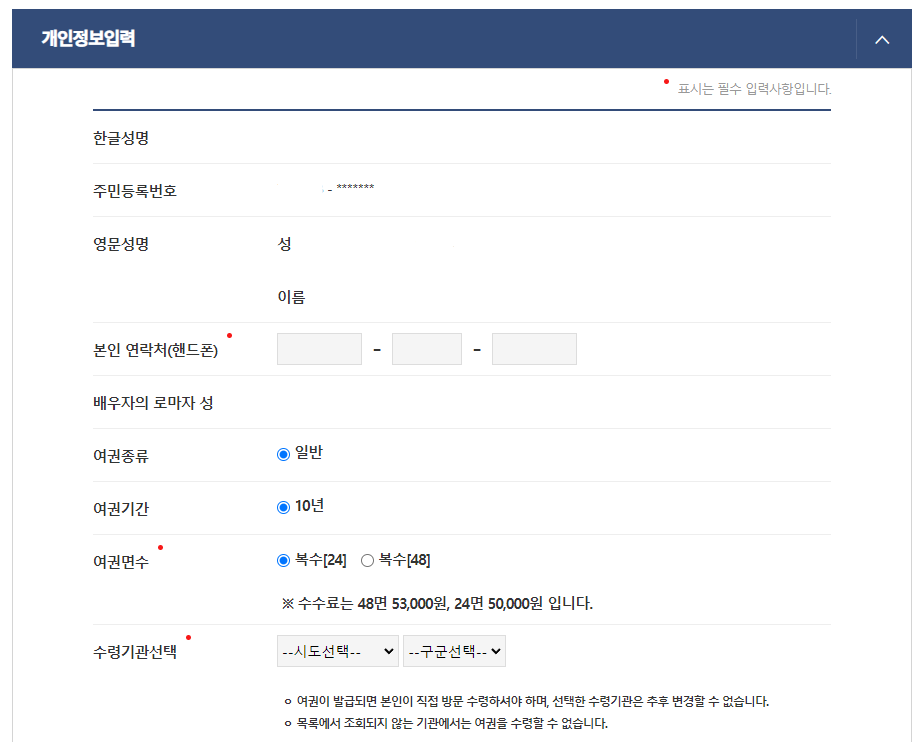 온라인 여권 재발급 여권종류는 일반 10년 유효기간으로 여권면수에 따라 수수료가 다른데 24면 복수여권은 50,000원 / 48면 복수여권은 53,000원입니다. 온라인 여권발급 신청이 반려되면 반려 사유에 따라 반환되지 않을 수 있으므로 발급신청 시 주의사항을 참고해서 진행해야 겠습니다.