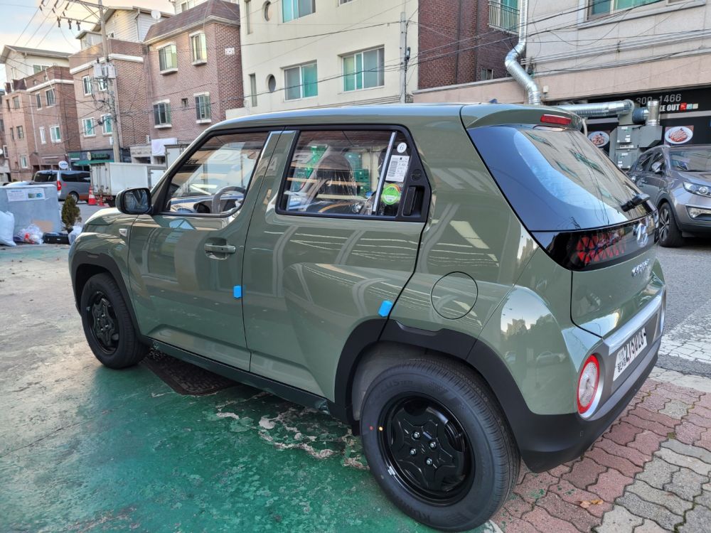 오전에 결제 후 2시간만에 집 근처 지정 썬팅매장에 캐스퍼가 와 있다고 해서 부랴 부랴 달려갔더니 추운 날씨가 캐스퍼가 매장 밖에서 떨고 있더라구요. 갑작스럽게 떨어진 기온 때문에 썬팅도 되어 있지 않아서 더 춥게 느껴지는데 출고매장에서 썬팅지 고르고 블랙박스까지 장착 완료하고 자동차보험가입 및 등록업체 통해 번호판 선택으로 진짜 마이카가 되었습니다.