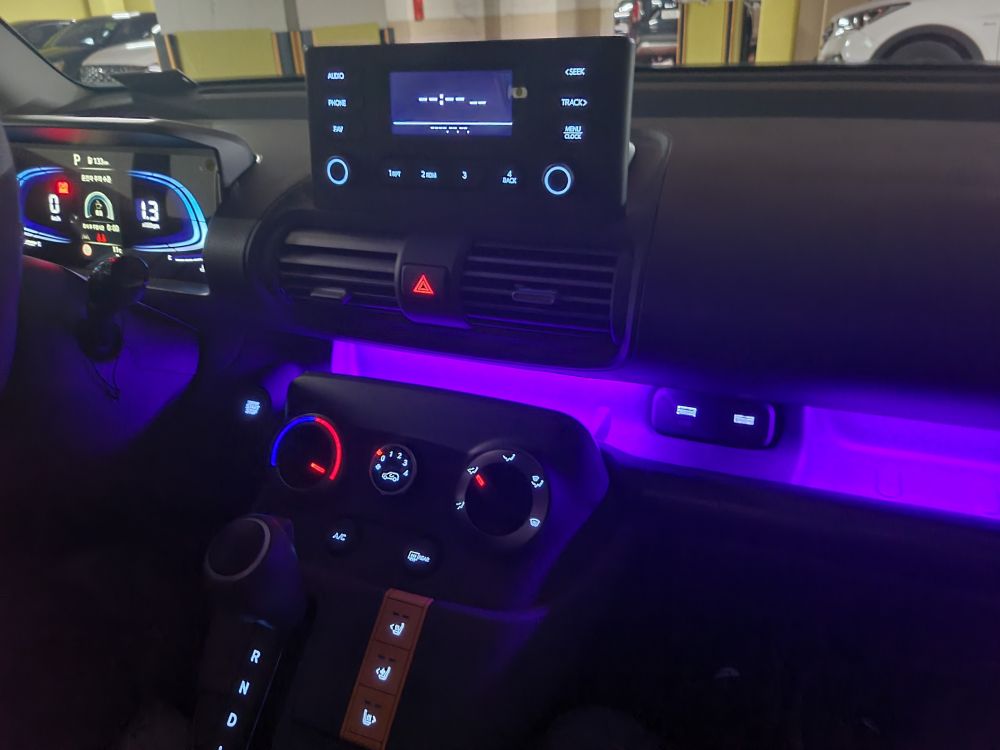 자동차 내부에 무드등이 달려있는 건 처음 보네요. 옵션아니고 기본으로 장착되어 있는데 보라색 무드등 분위기 짱입니다. 요즘 출고되는 자동차 계기판은 모두 LED 패널인지 모르겠지만 캐스퍼 계시판 LED로 되어 있어서 깔끔합니다. 스피드미터, RPM 등 한 눈에 쏙쏙 들어옵니다. 무엇보다 내비게이션이 없는데도 계기판으로 속도제한 구역인지 안전속도 등 표시되는데 이건 무슨 기능인지 모르겠지만 제 메인차에서는 볼 수 없는 기능이라 캐스퍼가 더 마음에 드는 점이네요.