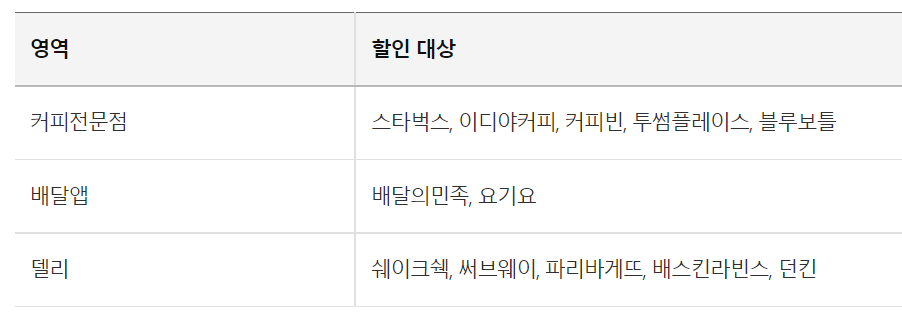 많이 쓰는 영역 30% 자동 맞춤 할인은 커피전문점, 배달앱, 델리 영역 중 이용금액이 가장 큰 1개 영역에 대해 30%를 결제일 할인 받게 됩니다.