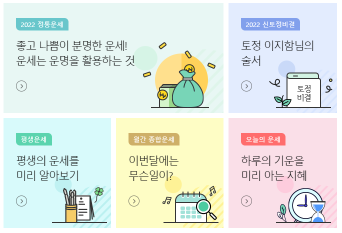 신년운세 뿐만 아니라 좋은 날 받기, 재뭉운세, 애정궁합 등 운세관련 서비스를 회원가입이나 유료 결제 없이 편리하게 이용할 수 있는 서비스는 농협 신년운세 같습니다. 신토정비결이라는 것이 토정 이지함의 술서를 바탕으로 진행하는 것이므로 신년운세는 비슷한 결과가 나올 거예요.