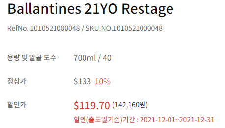 본론으로 돌아와서 발렌타인 21년산 가격 면세점 기준으로 정상가 $133 인데 대부분 면세점마다 주류 할인이 있으므로 10% 적용하면 $119.70 원화 계산시 142,160원에 구입할 수 있습니다.