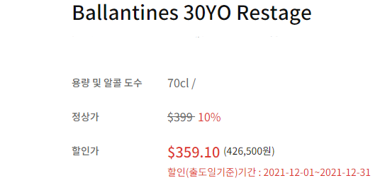 발렌타인 30년산 가격 면세점 기준으로 정상가 $399 인데 대부분 면세점마다 주류 할인이 있으므로 10% 적용하면 $359.10 원화 계산 시 426,500원에 구입할 수 있습니다.