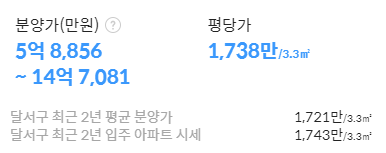 대구 빌리브 라디체 발코니확장 공사 금액을 포함 평단가를 계산해보면 1,778만원~1,989만원에 형성되어 있는데 달서구 최근 2년 평균 분양가는 1,721만원 / 2년 입주 아파트 시세는 1,743만원으로 시세보다는 높게 형성되어 있습니다.