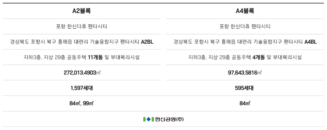 2개 블록으로 나눠지는 포항 한신더휴 펜타시티 아파트구성은 다음과 같습니다.