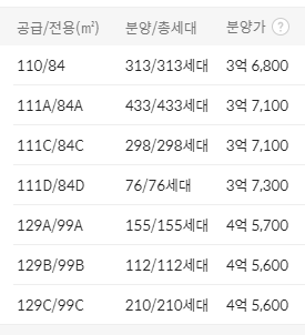 4블럭 분양가는 3억 6,500만원부터 3억 6,800만원으로 평당가 1,087만원입니다.