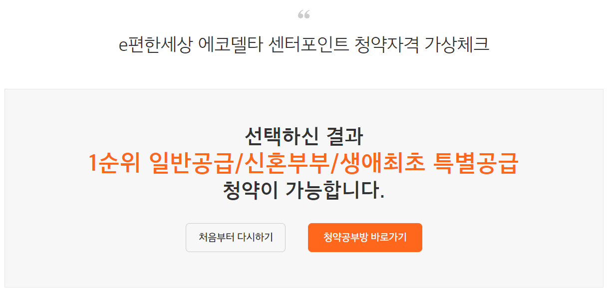 하지만, 청약자격 가상체크는 실제 청약자격 여부와는 차이가 있을 수 있으므로 청약과 관련된 상세 내용은 e편한세상 에코델타 센터포인트 입주자모집공고 공지를 확인해야 합니다.