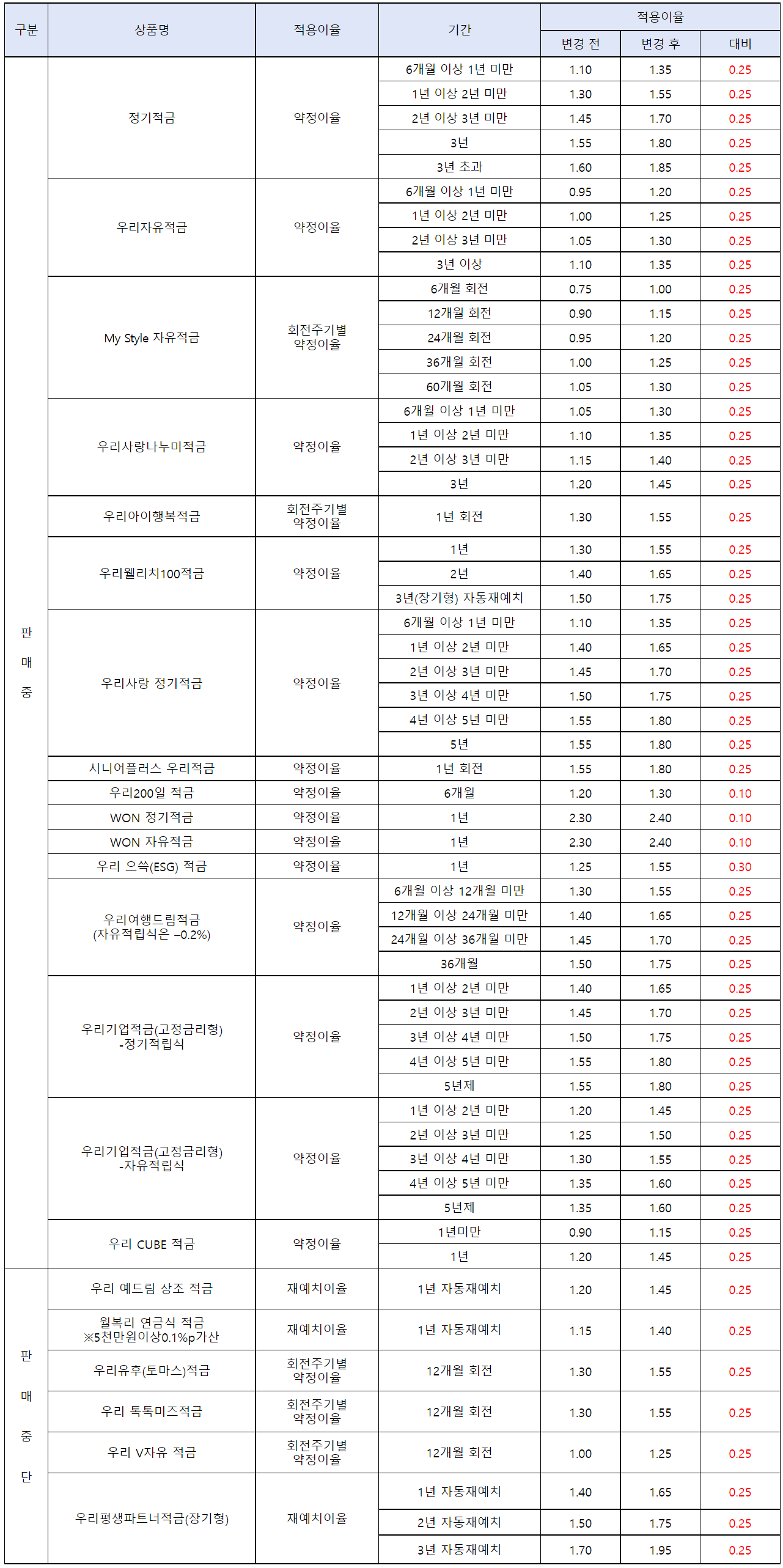 우리은행 예금금리 변경 시행일은 2022년 1월 17일 월요일부터이며 수신상품의 변경된 이율은 변경시행일 이후 적용됩니다. 적립식 예금과 거치식 예금은 계약 당시 약정이율을 만기까지 적용하므로 변경 시행일 이전 신규 가입자에는 반영되지 않으므로 참고하세요.