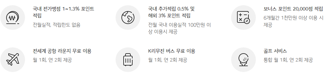 기본 적립으로 전월 국내가맹점 이용실적 100만원 이상 시 제공되는데 월 적립한도는 5만점 으로 해외 직구 등 온라인결제도 포함되므로 해외직구 자주 이용한다면 괜찮은 기본혜택입니다.