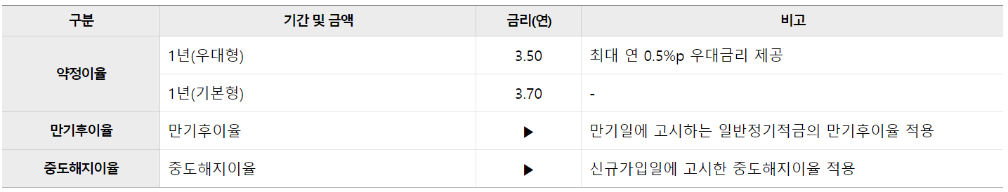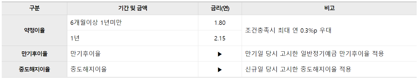 만기 후 이율은 만기일 고시하는 일반정기예금의 만기후 이율이 적용되며, 중도해지이율은 신규가입일 고시한 중도해지이율이 적용됩니다.